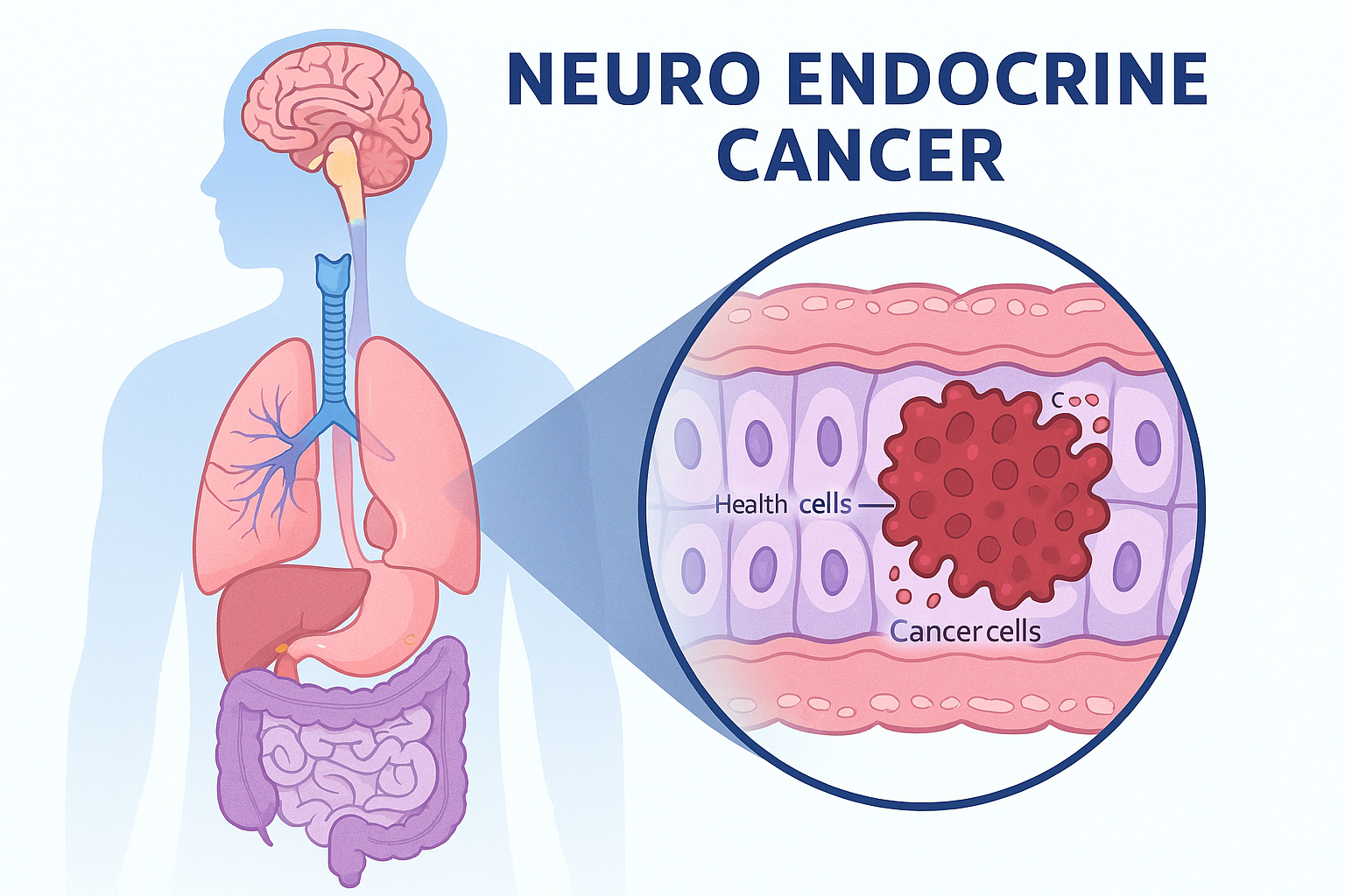Här är bilden som illustrerar Neuroendokrin cancer – en medicinsk visualisering som visar tumörceller i ett organ med fokus på cellstruktur och hormonproducerande vävnad.